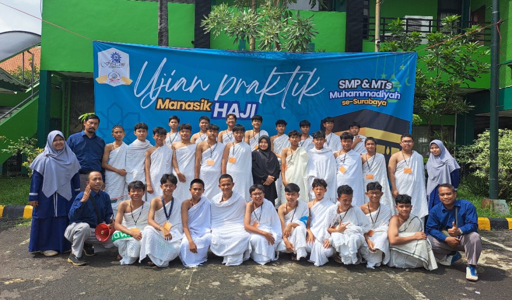 Sebanyak 88 siswa kelas 9 SMP Muhammadiyah 4 Surabaya turut serta dalam ujian praktik manasik haji yang digelar oleh Forum Silaturahim dan Komunikasi (Foskam) Kepala SMP/MTs Muhammadiyah Kota Surabaya. Kegiatan ini berlangsung di Asrama Haji Sukolilo Surabaya pada Selasa (24/2/2025) dan diikuti ribuan siswa dari berbagai SMP Muhammadiyah se-Kota Surabaya.