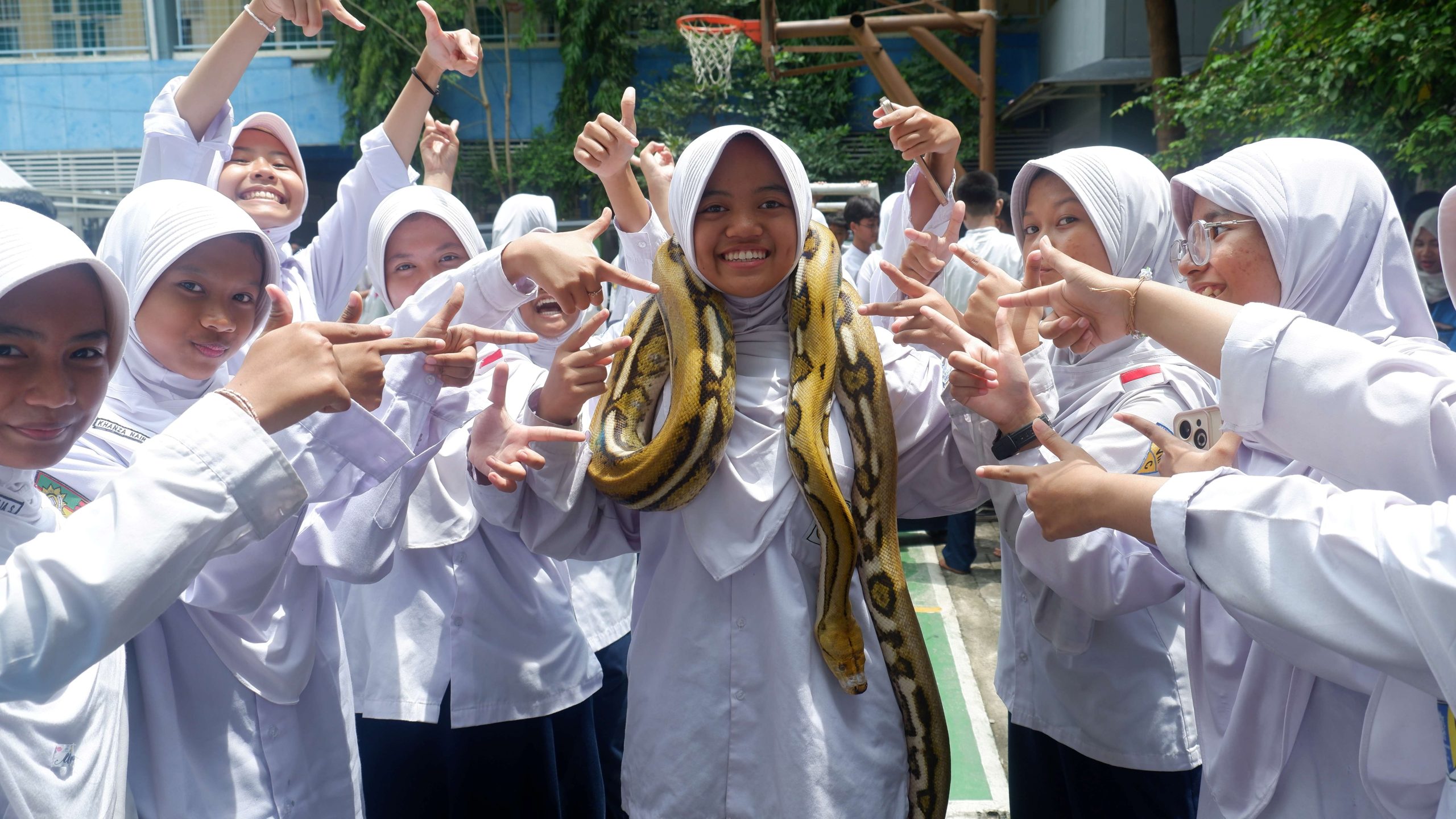Lidah Menjulur, Siswa Spempat Tak Gentar Sentuh Ular Raksasa