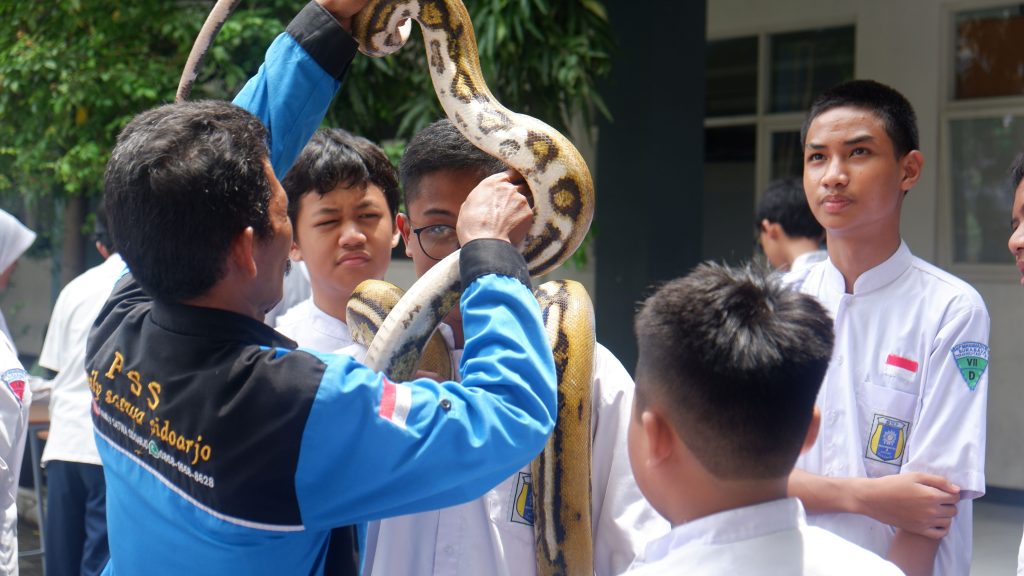 Peringatan Hari Cinta Puspa dan Satwa Nasional (HCPSN) di SMP Muhammadiyah 4 Surabaya, Senin (24/11), berlangsung meriah. Ratusan siswa tampak serius mengamati gerak-gerik ular sanca kembang berwarna kuning yang badannya seukuran paha orang dewasa. Momen yang jarang terjadi ini menjadi bagian dari upaya sekolah menumbuhkan kesadaran dan kepedulian terhadap pelestarian flora dan fauna khas Indonesia.