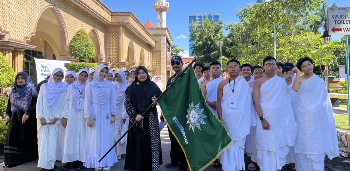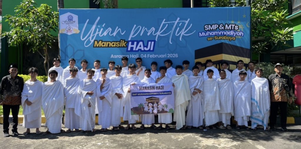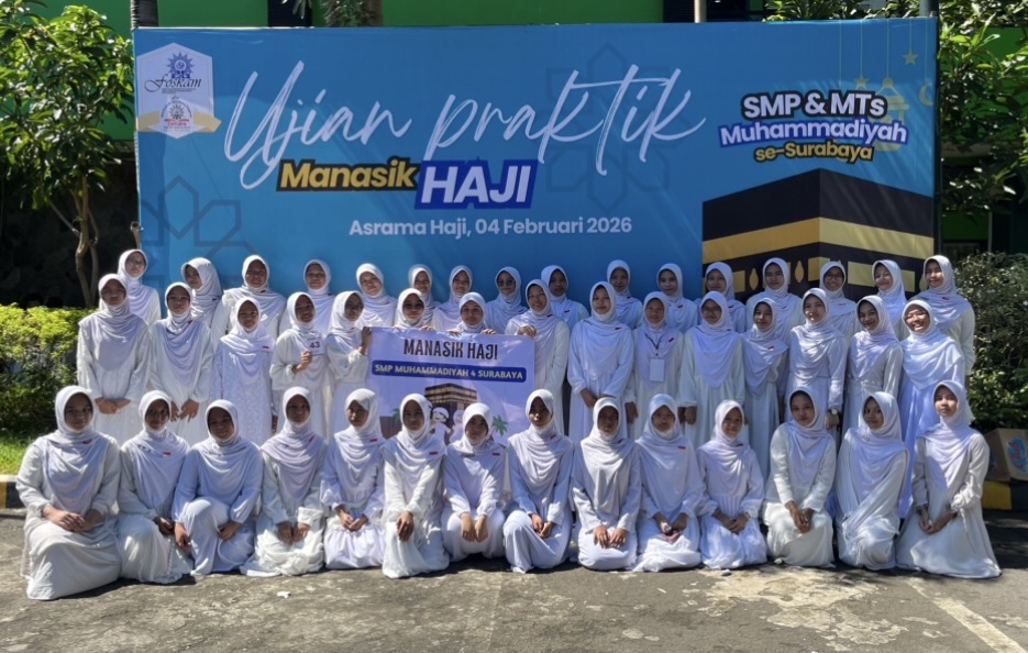 SURABAYA – Gema talbiah “Labbaik Allahumma Labbaik” membahana di kompleks Asrama Haji Sukolilo, Surabaya, Selasa (3/2). Di bawah terik matahari pagi, sebanyak 75 siswa kelas 9 SMP Muhammadiyah 4 Surabaya tampak khusyuk mengikuti simulasi rukun Islam kelima dalam gelombang kedua praktik manasik haji massal.